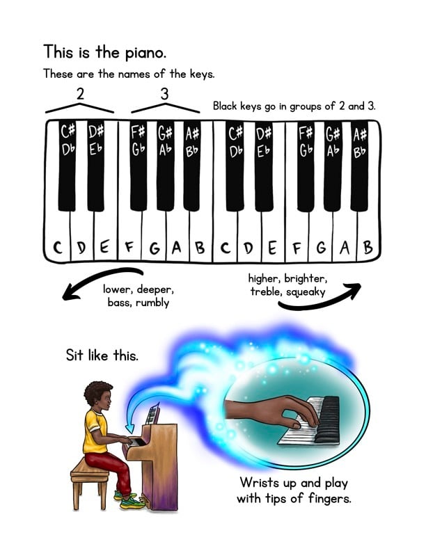 This series is generally meant to be used in combination with a piano teacher and for students aged 7 or older. The music is written to be easy to learn by ear or by reading, and is heavily influenced by video game and film music. Go to a jungle party, have a space ship war, feed a fish, and defeat a ferocious basilisk!